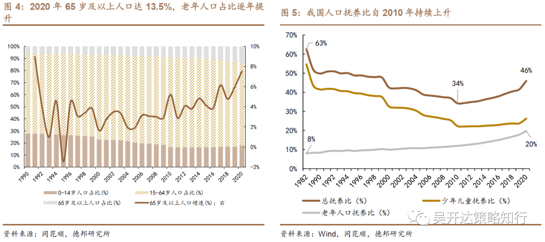 据七普结果我国即将进入中度老龄化社会,老龄化是我国未来长期面临的人口问题。根据七普人口数据,2020年我国65岁以上人口占比13.5%,相比2010年的六普结果65岁以上人口占比8.87%增加了4.63 pct,我国老龄化程度进一步加深。以当65岁以上人口占比分别达7%/14%/21%时社会进入轻度/中度/重度老龄化的标准来看,当前我国已接近中度老龄化水平。据国务院近期颁布的《关于优化生育政策促进人口长期均衡发展的决定》,预计“十四五”期间我国将进入中度老龄化阶段、约2035年将进入重度老龄化阶段,我国已处于老龄化加速发展阶段。