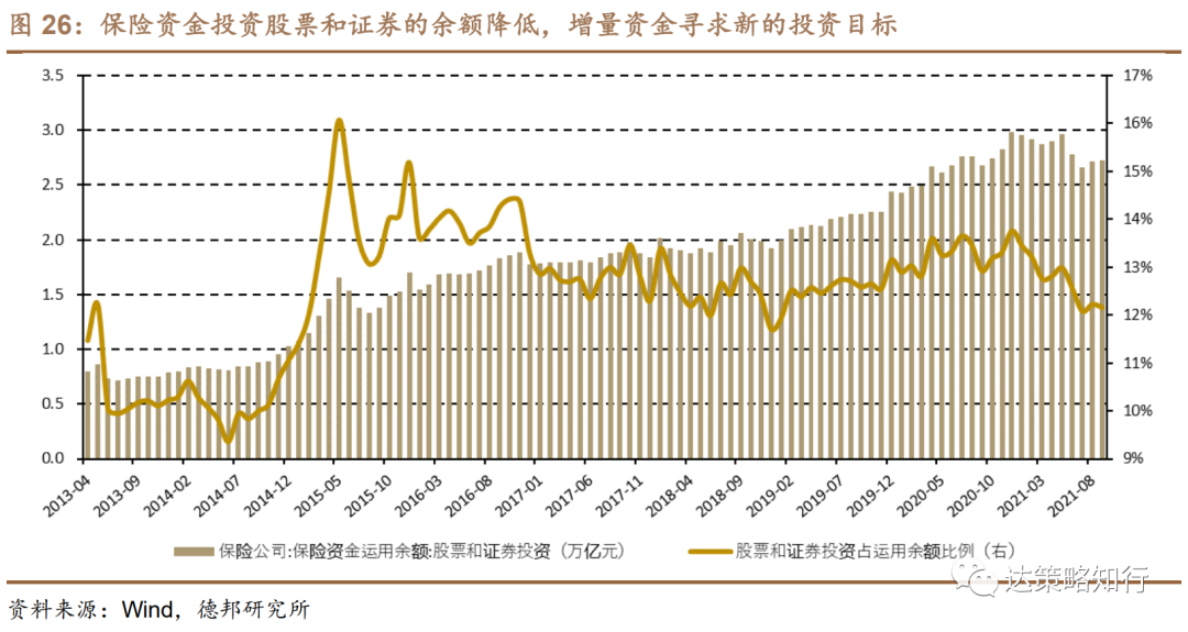 保险资金运用余额稳健上行,但股票和证券投资运用余额及占比在2021年双双降低,险资增量资金寻求新的可投标的。保险资金运用余额在2021年呈稳健上行的趋势,但其中股票和证券投资的运用余额却较2020年底下降了约2300亿元,整体在险资运用余额的占比也从2020年底的近年高点13.76%,下降至12.16%。在股票和证券投资占比双双降低的大趋势下,保险资金亟需新的可投资标的产品,保险机构将公募REITs纳入投资范围内不仅可以满足增量资金的投资需求,同时还可以优化当前投资组合的资产配置。