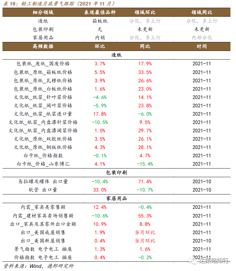 2021年11月,造纸方面,包装纸价格环同比全线上涨,其中箱板纸、瓦楞纸价格环比分别增长5.5%、3.9%,国废价格上涨3.7%,白板纸价格上涨1.6%,文化纸中,除针叶浆、阔叶浆、内盘漂针浆价格出现下降外,其余价格较上月上涨,其中铜版纸价格环比涨幅最大,达4.3%,同比增幅达28.1%,内盘漂针浆降幅最大,达10.5%,纸浆进口量环比上升17.8%,同比则下降6%,白卡纸价格指数较上月微降0.1%,领域环比景气度分化。家居用品方面,国内方面家具类零售额与上月相比增长12.4%,但不及去年同期,建材家具卖场销售额环比下滑,降幅达10.6%,同比增幅达55%+,插座景气度和价格指数继续回暖,环比涨幅分别为1.3%和0.4%,领域环比景气度分化。