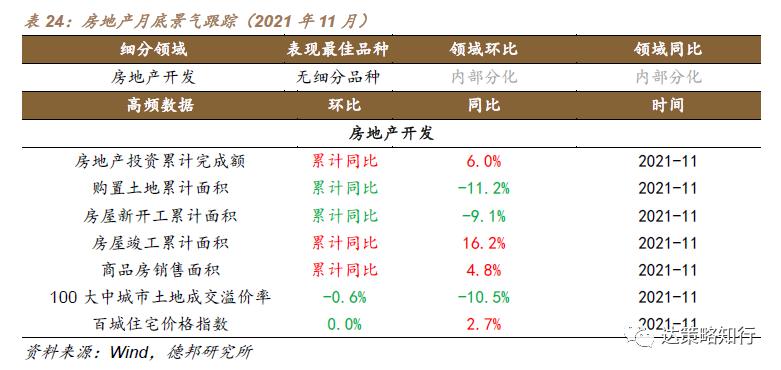 2021年11月,房地产开发方面,量端房地产累计投资完成额同比增长6%,购置土地累计面积同比下滑11.2%,房屋新开工累计面积同比下滑9.1%,房屋竣工累计面积与商品房销售面积同比分别增长16.2%、4.8%,价端土地成交溢价率较上月下降0.6%,百城住宅价格指数环比较上月基本持平,同比则增长2.7%,领域环比景气度分化。