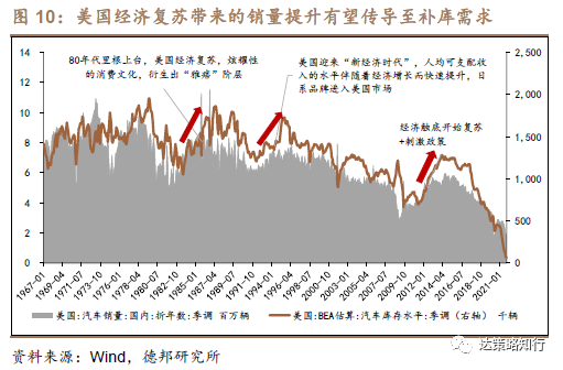 美国汽车销量增速与经济大势相关性更高,未来经济复苏带来的销量提升有望传导至补库需求。2006~2019年,美国汽车销量增速与人均可支配收入相关系数约为0.38,而美国GDP同比与汽车销量增速相关系数高达近0.75。20世纪70年代以来,美国汽车库存水平显著提升均伴随着销量增长,在库存历史大底背景下,未来销量回升有望带动补库周期反转。