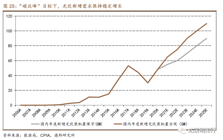 2030“碳达峰”目标下,预计“十四五”期间光伏新增需求保持稳定增长。根据CPIA预测,2021年国内光伏装机55-65GW,2022年国内光伏装机60-75GW。在集中式和分布式项目共同推进下,“十四五”期间年均光伏新增70-90GW,光伏装机需求有望保持快速增长。