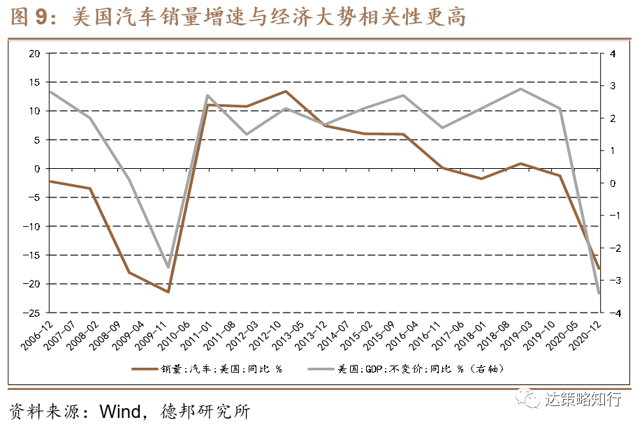 历史上美国汽车销量增速与人均可支配收入变化基本同向,但2020年发生背离。主要原因归结于两点:1)防疫要求下居家常态化,出行相关的汽车需求对应下行;2)原材料涨价传导至新车端,美国新车消费价值指数显著提升,压制消费需求。