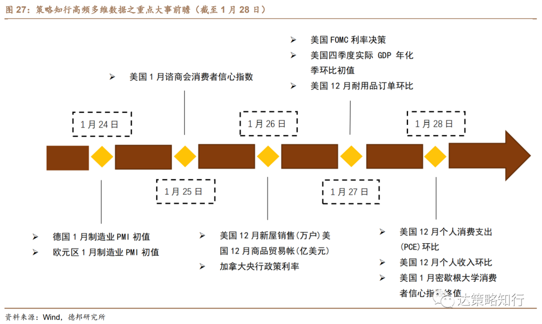 展望后市:(1)房地产:货币条件已转向宽松,待政策继续改善后,预计地产将逐渐探明底部区间。降息后,1月17日,央行下调MLF利率10BP,1 月20 日5 年期LPR下调5个BP,有望推动地产开发贷和居民按揭贷款边际改善。预计未来“因城施策”和“推进保障性住房”将发力,地产将在政策和预期改善中逐渐探明底部区间。(2)基建:财政前置发力,基建有望开门红。12 月中央经济工作会议中提出要保证财政支出强度、加快支出进度,近期多地重大项目密集开工,基建有望迎来开门红。(3)制造业:上游成本压力下降+政策支持,制造业有望保持韧性。