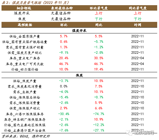 2022年11月,煤炭开采方面,供给端,全国原煤产量同比上行5.5%,环比上行5.7%,需求端,国有重点煤矿销量同比下行1.2%,环比上行1.3%。价格端,动力煤价格同比上行19.4%,环比上行10.0%。焦炭方面,供给端,焦炭产量环比下行3.7%,需求端,生铁产量环比下行4.0%,库存方面,六港口炼焦煤库存环比下行30.4%,样本钢厂炼焦煤库存环比下行2.1%,价格端,炼焦煤和冶金焦价格分别环比下行2.6%和7.6%。