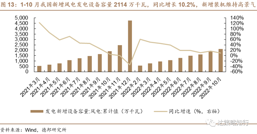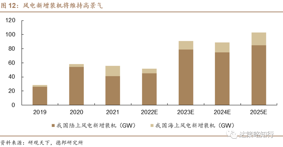 国家发展改革委、国家能源局3月22日发布《“十四五”现代能源体系规划》,提出到2025年,非化石能源消费比重提高到20%左右,非化石能源发电量比重达到39%左右。规划具体提出加快发展风电、太阳能发电、因地制宜开发水电和积极安全有序发展核电等。在“双碳”目标下,风电作为清洁能源迎来快速发展期。1-10月我国新增风电发电设备容量2114万千瓦,同比增长10.2%,新增装机维持高景气。根据研观天下整理,预计2023年我国风电新增装机合计91GW,同比增长76.7%,其中陆上风电新增装机和海上新增装机分别为79GW和12GW,2025年风电新增装机合计将达到103GW,维持高景气。