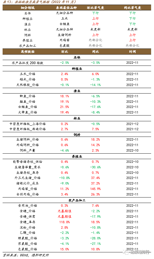 下游消费:2022年11月,农林牧渔行业,总体环比景气度下行,种植业、渔业、饲料环比景气度上行,养殖业、农产品加工环比景气度分化;食品饮料行业,白酒环比景气度持平,非白酒环比景气度上行、调味发酵品环比景气度下行,饮料乳品环比景气度分化;医药生物行业,化学制药环比景气度下行,中药、医药商业环比景气度上行;纺织服装行业,服装家纺环比景气度分化,纺织制造环比景气度下行,饰品环比景气度上行;轻工制造行业,造纸环比景气度上行、家居用品环比景气度分化;家用电器行业,总体环比景气度上行,厨卫电器和照明设备环比景气度下行,黑色家电环比景气度上行,白色电器环比景气度分化;汽车行业,整体景气度下行,乘用车环比景气度下行,商用车、汽车零部件环比景气度内部分化,摩托车及其他环比景气度上行;传媒行业,游戏环比景气度上行,影视院线环比景气度下行;休闲服务行业,酒店餐饮、旅游及景区环比景气度下行;美容护理行业,个护用品、化妆品环比景气度均上行。
