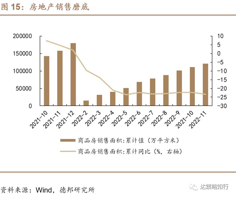 政策逐步加码稳地产,基本面磨底。 (1)中央层面: 10月24日,央行党委、外汇局党组,证监会党委,银保监会党委分别召开扩大会议,传达学习党的二十大、二十届一中全会精神,会议内容涉及股市、债市、楼市、汇率等方面。央行、外汇局会议提出加强部门协作,维护股市、债市、楼市健康发展,要求更好满足居民的刚性和改善性住房需求,加大力度助推“保交楼、稳民生”工作。(2)需求侧:8月5年期LPR降低15BP,降低居民购房按揭贷款成本,促进居民中长期贷款恢复。9月29日,人民银行、银保监会发布通知,决定阶段性调整差别化住房信贷政策。符合条件的城市政府,可自主决定在2022年底前阶段性维持、下调或取消当地新发放首套住房贷款利率下限。9月30日,财政部发布支持居民换购住房有关个人所得税政策的公告,自2022年10月1日至2023年12月31日,对出售自有住房并在现住房出售后1年内在市场重新购买住房的纳税人,对其出售现住房已缴纳的个人所得税予以退税优惠。同日,央行决定从10月1日起下调首套个人住房公积金贷款利率0.15个百分点,5年以下(含5年)和5年以上利率分别调整为2.6%和3.1%。(3)供给侧:银保监会有关负责人在通气会上表示,将进一步落实好房地产金融审慎管理制度,有效满足房地产企业合理融资要求。交易商协会再次召集多家民营房企召开座谈会,探讨通过中债增进公司增信支持的方式支持民营房企发债融资。11月8日,中国银行间市场交易商协会网站发布消息,为落实稳经济一揽子政策措施,坚持“两个毫不动摇”,支持民营企业健康发展,在人民银行的支持和指导下,交易商协会继续推进并扩大民营企业债券融资支持工具(“第二支箭”),支持包括房地产企业在内的民营企业发债融资。11月23日,央行、银保监会正式发布《关于做好当前金融支持房地产市场平稳健康发展工作的通知》,提出保持房地产融资平稳有序、积极做好“保交楼”金融服务、积极配合做好受困房企风险处置、依法保障住房金融消费者合法权益、阶段性调整部分金融管理政策和加大住房租赁金融支持力度的六大方面十六条措施。11月28日,证监会新闻发言人就资本市场支持房地产市场平稳健康发展答记者问称,房地产市场平稳健康发展事关金融市场稳定和经济社会发展全局。证监会决定在股权融资方面调整优化5项措施,并自即日起施行。一、恢复涉房上市公司并购重组及配套融资。二、恢复上市房企和涉房上市公司再融资。三、调整完善房地产企业境外市场上市政策。四、进一步发挥REITs盘活房企存量资产作用。五、积极发挥私募股权投资基金作用。