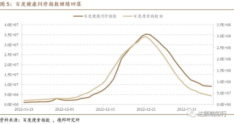 目前第一轮疫情感染可能已经接近尾声。百度健康问诊指数、搜索指数在12月21日见顶以后持续回落,截至1/6,健康问诊指数是12月12日以来新低,搜索指数是12月5日以来新低。有数据的307个地级市中全部下降,仅有34个城市进度在10%以上。由于百度搜索指数对于疫情感染的峰值是领先或同步的,因此目前疫情感染情况可能已经接近尾声。