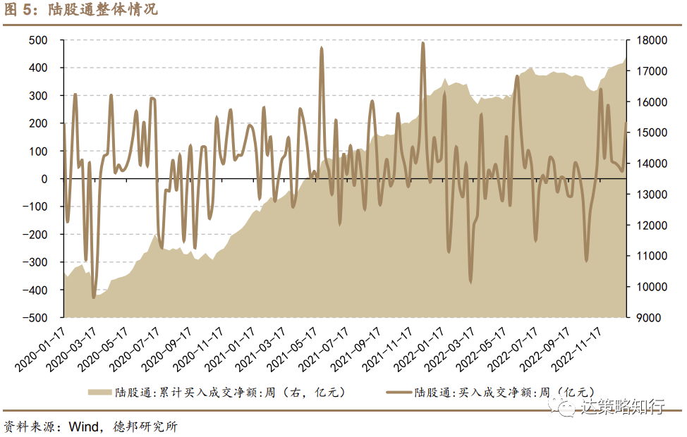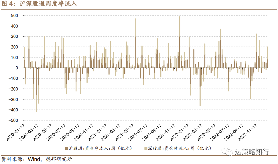 南向资金:维持净流入大趋势。本期南向资金净流入171亿元,相比于上期净流入35亿元变化+395%。南向资金在2023开年前后重回较明显的净流入趋势。