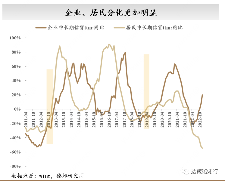 突破寻底期的关键在于M1回升的持续性,居民中长贷才是更加核心的指标,而居民中长贷与商品房销售周期关系紧密。居民中长贷和企业中长贷的底部通常比较接近并且市场寻底期间(下图底色为上述寻底期阶段),这两项指标在同比意义上均出现回升,并且居民中长贷往往在绝对量上已经开始回升。但目前企业、居民出现分化,居民中长贷滚动加总同比增速更是2011年以来最低,反映居民信心缺失。