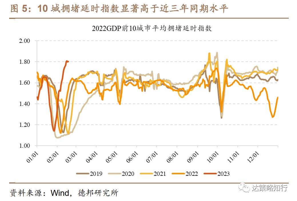 交运方面,拥堵延时、地铁客运量显著回升。10城拥堵延时指数的平均值已经显著高于过去4年水平,而一线城市地铁客运量7日均值也已经高于2022年全年最高值,且仍然处于修复过程,2月16日报3537.23万人次,2019年全年高点为约3900万人次。