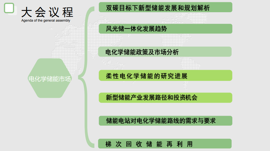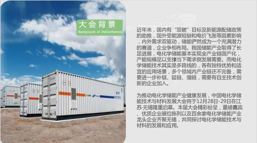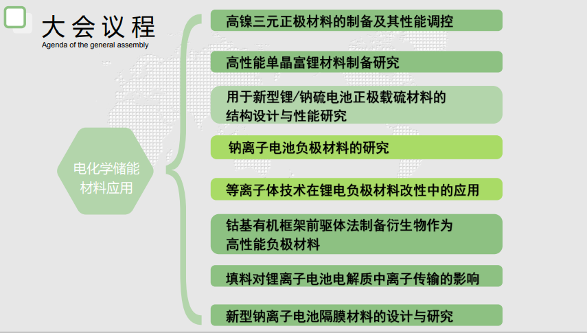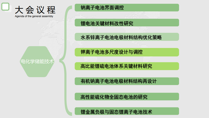 【中国电化学储 能技术与材料发展大会】议程主要分为“电化学储能市场”、“电化学储能技术”、“电化学储能 材料应用”这三大部分。