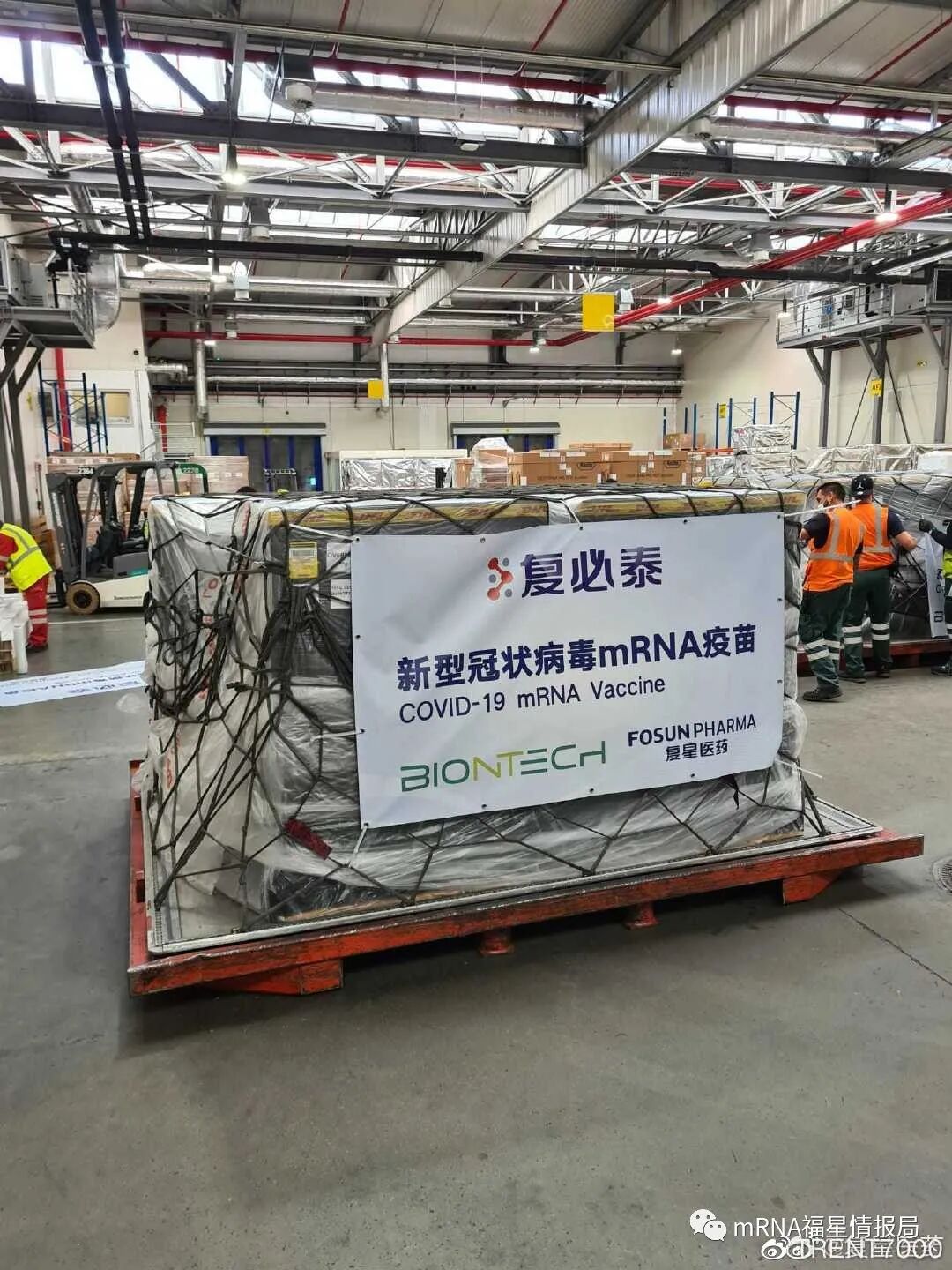 2021年7月。复星吴以芳在股东大会上表示,国家药监局对mRNA新冠疫苗“复必泰”的审定工作已经基本完成,专家评审已经通过了,目前正在加紧进行行政审批阶段。在供货问题上,复星医药已经与BioNTech提前启动生产准备工作,复必泰疫苗一旦获批,就能第一时间供应到国内。2021年6月9日,新包装第一批(公开信息)简体中文标签复必泰出厂,批号1F032A,2021年7月15日,批号1G042A,2021年7月17日,批号1G043A,三批至少约270万剂。