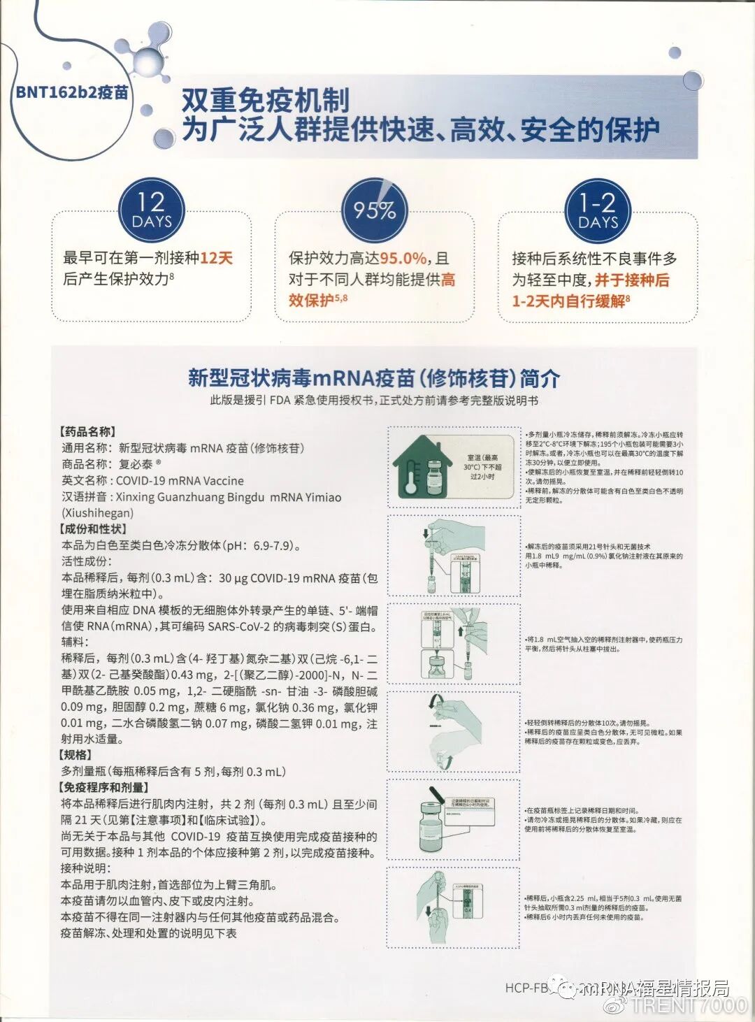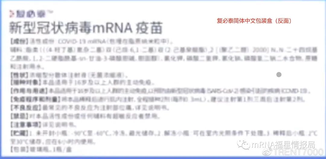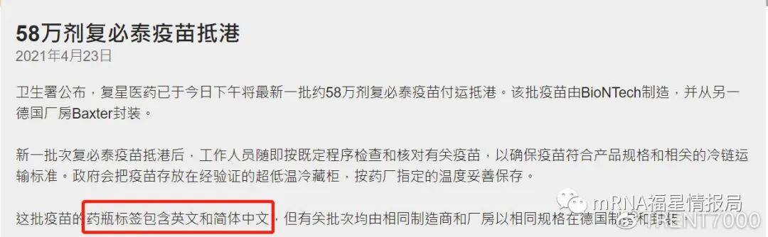 同期一份内地版复必泰说明书中规格写的是多剂小瓶包装,0.45mL每瓶。接种对象中写有中国18-85岁人群接种本品的II期临床研究尚在进行中。这说明当时复星是有意使用II期中期数据+国际III期数据申请EUA或BLA,但相关部门没有批准,因此将第一批预先生产的简体中文标签疫苗转到了香港地区。