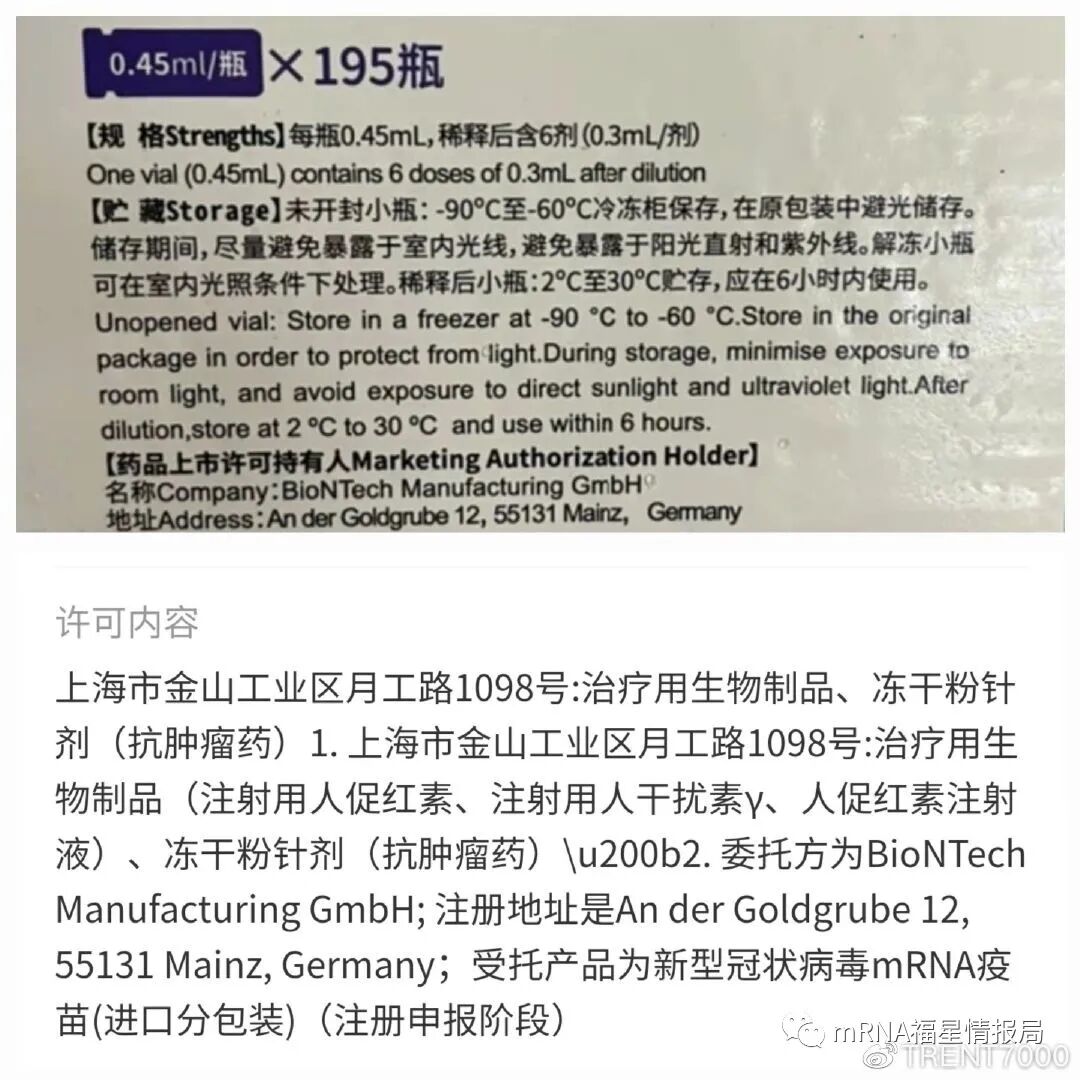 2021年6月,上海凯茂生物获得上海市药监局行政许可,产品为新型罐装病毒mRNA疫苗(进口分包装)(注册申报阶段),其中受委托方名称以及地址与第一批送往台湾的包装上信息一致。