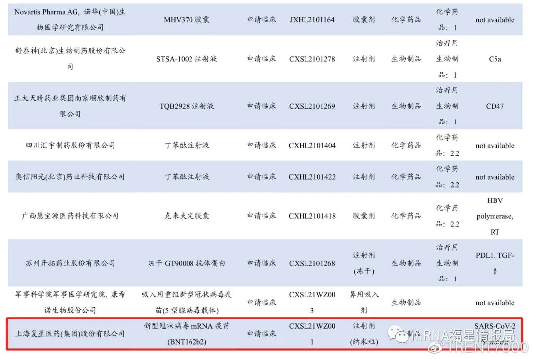 2021年8月,复必泰没有如期上市,复星向药监局申请临床,受理号CXSL21WZ001,CXSL意味着国产新生物制品申请临床,WZ为2021年后药监局为新冠类药品新设置的独立号段,审批结论未知。