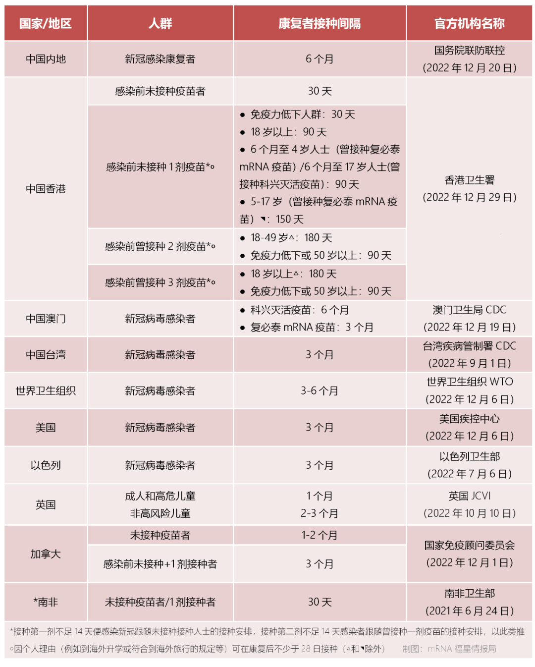 我国香港对新冠感染康复后接种疫苗方案的最为详细,同时考虑特殊人群的接种需求,香港地区对无接种史及免疫力低下人群也给出了30天的建议接种间隔,这些感染后康复人群包括: