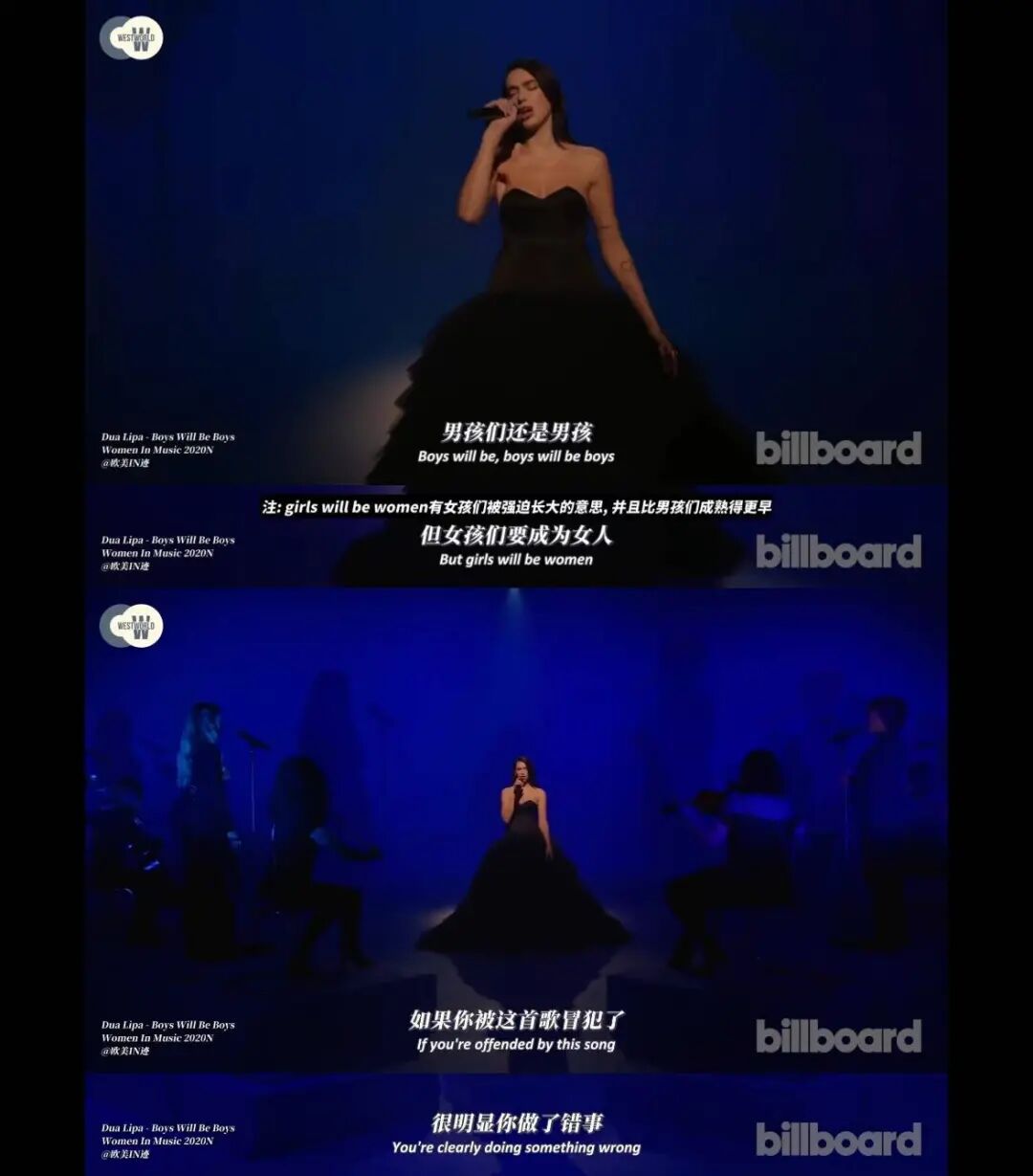 这是我的朋友写的一首女权说唱!歌曲刚一发布我就去循环了十几遍。我觉得她的歌词都是从自身的经历出发,从自己经历的痛苦中提炼出来的,然后她把这些痛苦化成力量,用音乐作为载体表达了出来。她在歌词里面反击一直以来贯穿嘻哈文化的厌女思想,反击荡妇羞辱物化女性。我觉得对我来讲这就是离我最近的女性榜样。🎵 Boys will be boys - Dua Lipa第一次是在跑步的时候随机播到的,很喜欢里面先描述女性困境而后说boys will be boys but girls will be women,感觉很有力量,同时也很讽刺某些长不大的男人。后来在b站上看到了她穿着黑裙子唱这首歌,好像穿着战袍唱战歌一样。![]()
