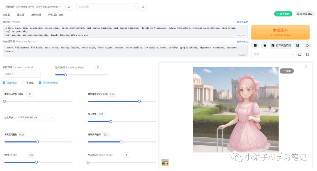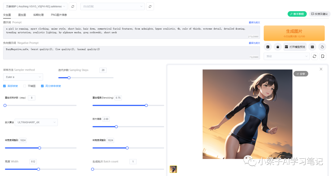 (2)对于生成的提示词,有时候关键词对应的实物元素比较多,出图可能会将我们需要重点描述的信息不展示或者展示效果不明显,因此对于出图中我们想展示的关键信息,我们可以给关键字的权重提高,效果会更好些。比如多组关键字生成的提示词中,部分图片将女孩的权重提高了(a girl:1.2)。