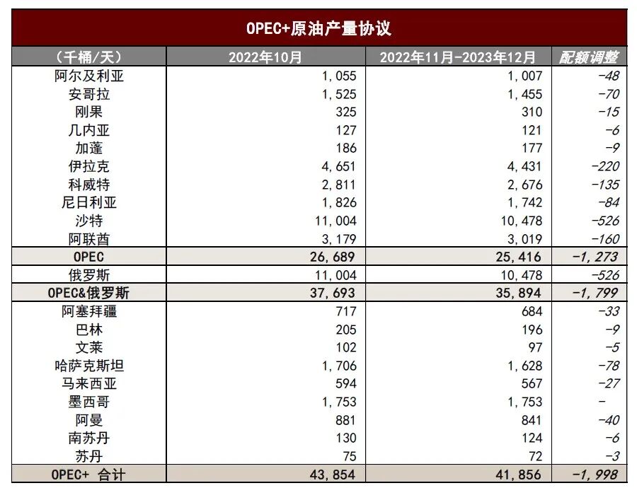 OPEC+产量会议于10月5日如期召开,决定在2022年11月至2023年12月期间减产200万桶/天,即将OPEC+协议国的目标产量从4385万桶/天下调至4185万桶/天,其中OPEC 10国的减产配额为127万桶/天。此外,OPEC+决定将联合部长级监督委员会议(JMMC)频率调整为2月/次,部长级会议(ONOMM)频率调整为6月/次,并确定下次JMMC会议于2022年12月4日召开。