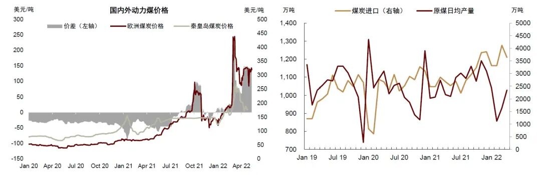 图表: 国内外动力煤价差保持在高位;煤炭产量和进口走势出现一定分化