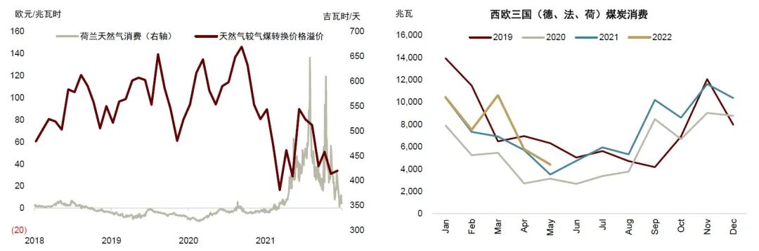 天然气与煤炭在发电与供热系统中互为替代,因此煤炭消费与天然气的价格息息相关。我们通过测算气-煤转换平价来衡量天然气与煤炭发电的经济性,所谓气-煤转换平价,是基于动力煤与天然气各自不同的热值与发电效率,根据当前动力煤价格与碳价测算的天然气平价价格。理论上在该价格下,天然气与煤炭的单位发电成本相同。去年四季度开始,天然气价格一直大幅高于欧洲平均气-煤转换平价之上,意味着天然气的发电成本相对于煤炭更加高昂,短期内也促进了发电和供热侧煤炭需求的增加。