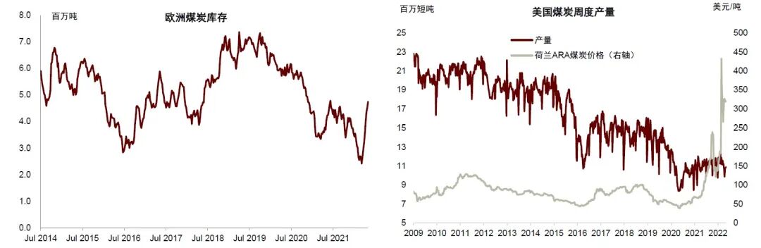 图表: 欧洲煤炭库存企稳回升;面对高价,美国煤炭产量缺乏弹性