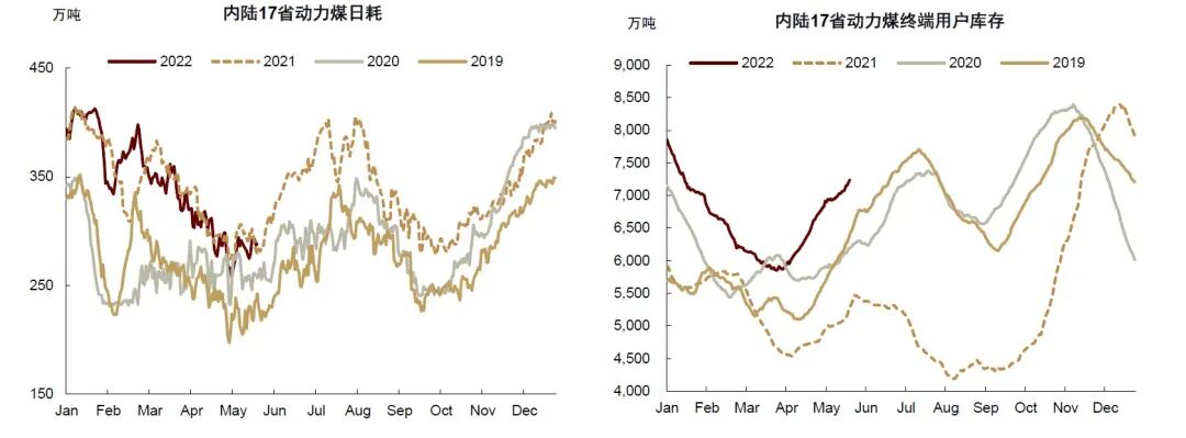 当前25省终端用户库存回升至近22天,较去年同比增加约7天的水平。从基本面看,我们预计今年国内供需将较去年有一定改善。但海外能源价格仍在高位波动的情况下,供给侧保供压力仍存,国内煤炭产能的释放仍需时间,供需短期内难言大幅放松。局部地区与部分时段煤价可能存一定上行压力,譬如对进口电煤依赖度较高的沿海地区,以及在疫后需求恢复期叠加夏季用电高峰等时段。