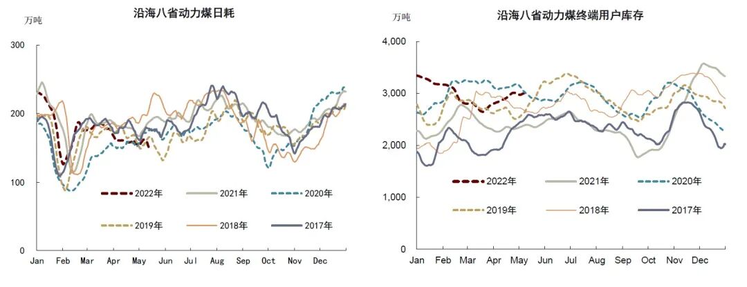 需求方面,受局部地区疫情反复拖累,今年至今煤炭消费与去年同期出现了小幅的下滑。分行业看,截至五月上旬火力发电量下滑了约2.2%。今年一、二月份在供暖与发电等需求的带动下,煤炭消费仍实现了正增长。但自3月中旬疫情反弹以来,全国火力发电量就进入了同比收缩区间。四月当月全社会用电量同/环比分别下降了1.3%和8.4%,其中第二与第三产业的同/环比下降幅度分别为1.4%/6.7%和6.8%/7.9%,显示疫情下除制造业生产活动被显著拖累外,服务业的经营活动也受到了较大影响,并且第三产业受影响幅度较二产更甚。4月制造业出口增速放缓也拖累一部分电力需求。另外,最近水力发电超预期,也挤占了一部分火力份额。5月上旬火力发电占比回落至65%左右,而去年同期约为72%。我们看到5月以来煤炭日耗与去年同期差距有拉大的趋势,除了需求环比仍未见明显好转外,今年五月气温偏低,对煤炭需求也是利空因素。在工业领域,水泥、冶金等行业的煤炭消费下滑也较为明显,1-4月水泥与生铁产量分别同比下滑14.8%和9.4%。我们认为主要是受到了地产新开工与施工下滑的拖累。