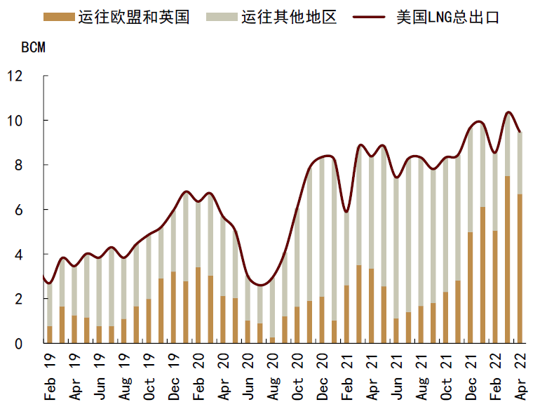 美国或将继续对欧加量出口LNG,双方年贸易量或不仅限于约定的400亿立方米。3月25日,欧盟和美国发布关于欧洲能源安全的联合声明[5],提出美国将努力确保在2022年为欧洲提供至少150亿立方米的LNG增量,这意味着2022年美国需出口约400亿立方米LNG至欧洲。从美国LNG输出能力和当前LNG运量来看,兑现400亿立方米的LNG出口承诺似乎不成问题。当前美国在营的LNG液化产能为1260亿立方米/年,远大于400亿立方米的LNG出口需求。实际上,年初以来美国便不断加大向欧洲的LNG出口,据路透社船期数据,2022年1-4月,美国出口382亿立方米LNG,其中大约有250亿立方米运往了欧洲。据目前荷兰TTF天然气和日韩JKM天然气的远期价格曲线来看,2Q-4Q22欧洲天然气相对亚洲天然气的价格溢价或将维持在2-6美元/百万英热之间。因此我们认为,欧洲天然气溢价或将持续吸引更多美国LNG运往欧洲。