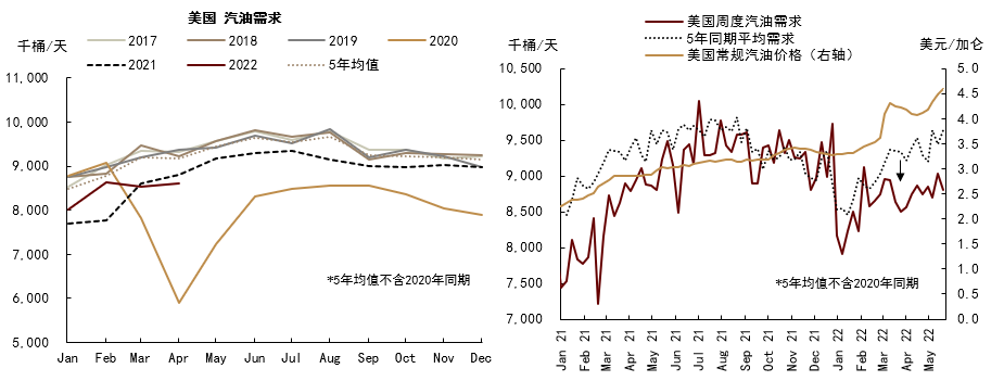 成品油价格的快速上扬已经对油品需求形成了一定压制,我们看到美国汽油需求在3-4月出现了逆季节性回落,而根据EIA的高频数据,随着汽油价格仍在攀升,美国汽油消费较5年均值的差距在5月仍在拉大,截至5月第三周,美国汽油需求已低于5年均值近10%。