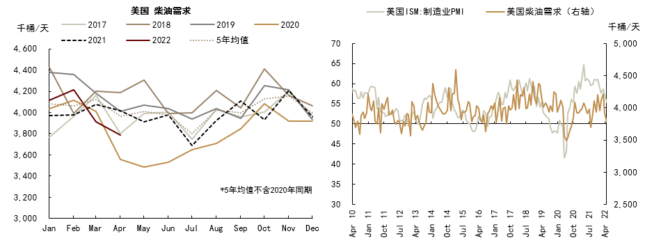 图表: 3-4月美国柴油需求出现超季节性下滑,但PMI仍处于景气区间