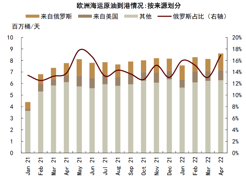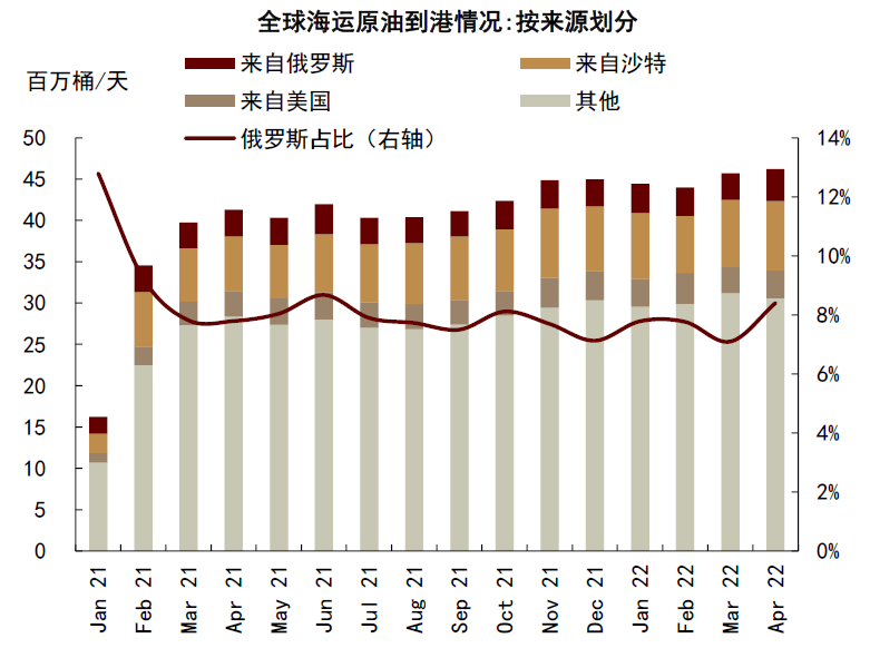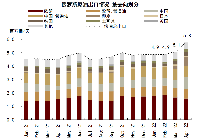 虽然俄原油产出减量在4月初步体现,但其石油贸易量还未受到实际影响,但贸易流向出现显著变化。根据路透船期数据,2022年3-4月俄罗斯海运原油的出港情况基本表现正常,日均出港量大约320-390万桶/天,甚至较2021年和2022年初的出口流速还有所增加。除海运原油出口外,2021年俄罗斯陆上原油出口量为190万桶/天,其中到达中国和欧盟的管道油出口分别大概为80和70万桶/天,而我们假定这部分出口流速仍保持稳定。