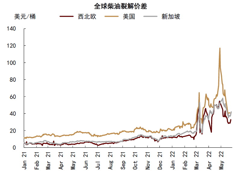 图表: 俄乌冲突以来全球柴油裂解价差快速攀升