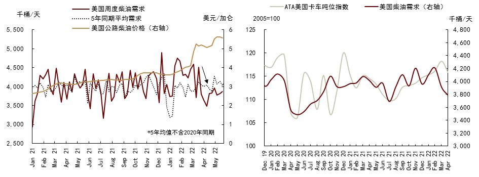 此外,美国的柴油需求也在3-4月出现超季节性下滑,而同期美国制造业PMI却始终处于景气扩张区间,4月ISM制造业PMI录得55.4。我们认为,高价格对卡车运输等领域的柴油需求产生的负反馈效果或许可以对这部分减量进行解释,我们看到3月以来,美国公路柴油价格当前已累计上涨36%,而美国货运协会(ATA)公布的卡车吨位指数也在4月边际回落2%,为2021年8月以来的首次环比下降。