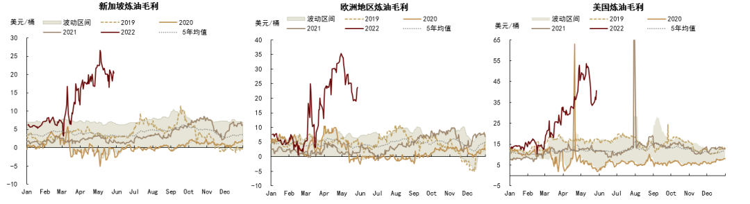 成品油裂解价差走阔支撑了全球炼油毛利快速攀升。在成品油裂解价差创下历史新高的同时,全球炼油毛利同样在3月以来出现超季节性走高,其中欧洲、美国和新加坡的炼油毛利在5月初分别筑顶35.3、53.6和26.1美元/桶,较2月底累计涨幅高达848%、228%和288%。