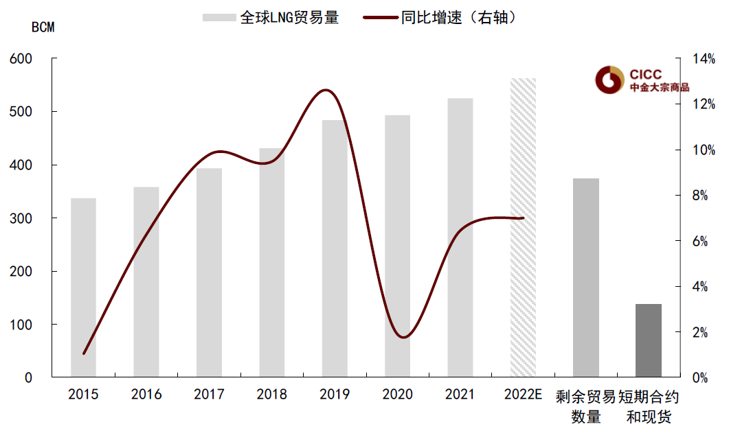 图表: 2022年5-12月剩余全球LNG贸易量及其中的短期合约和现货占比测算