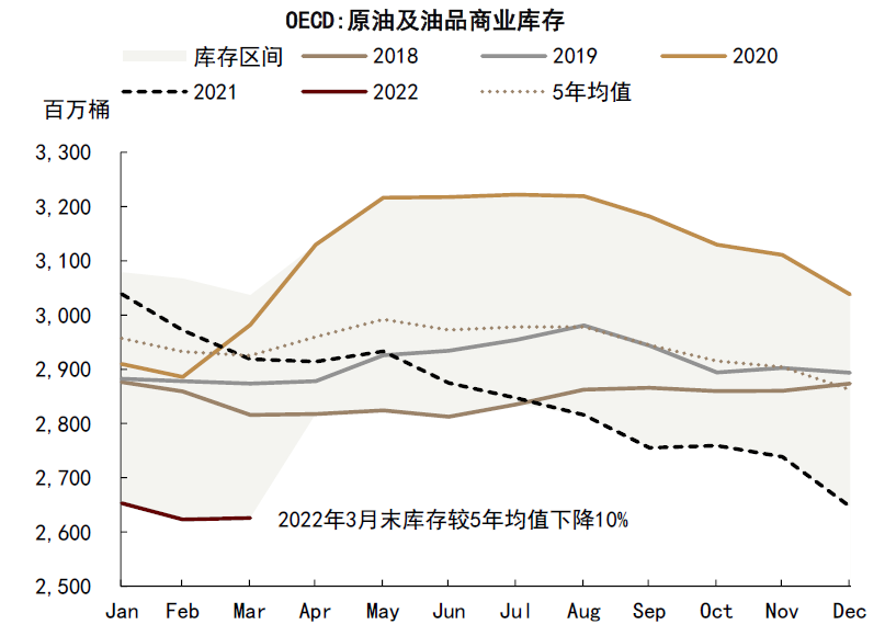 随着供给侧修复如期推进、需求侧增速回落,叠加疫情、负反馈等超预期因素加持,我们判断基准情形下全球石油供需缺口将实现收敛,并于2H22维持于紧平衡状态。虽然当前全球原油库存仍处历史绝对低位,但已于近期步入季节性的边际修复,2022年3月末OECD原油库存为9.9亿桶,较2月小幅增加2%。往前看,若地缘风险没有转化为全面的断供冲击,随着原油市场供需条件改善,我们认为全球库存压力可能将有所缓解。