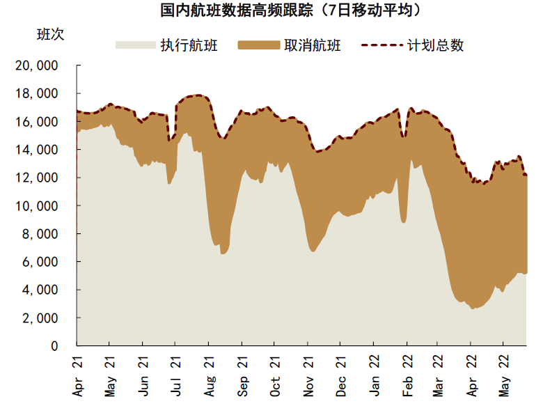 疫情反复将使2Q22淡季我国油品消费表现更淡。虽然上海确诊病例在5月初筑顶回落,市内交通情况也有一定修复,但较疫情前水平仍有20%的差距,而当前北京市内的交通拥堵延时指数也已下降近28%,且持续位于低点徘徊。航空出行方面,4月下旬以来国内航班执行情况已有边际改善,但较疫情冲击前仍存较大缺口,5月至今国内日均航班执行数量为4688班次,较2月减少63%,而取消航班数量则增加了116%。