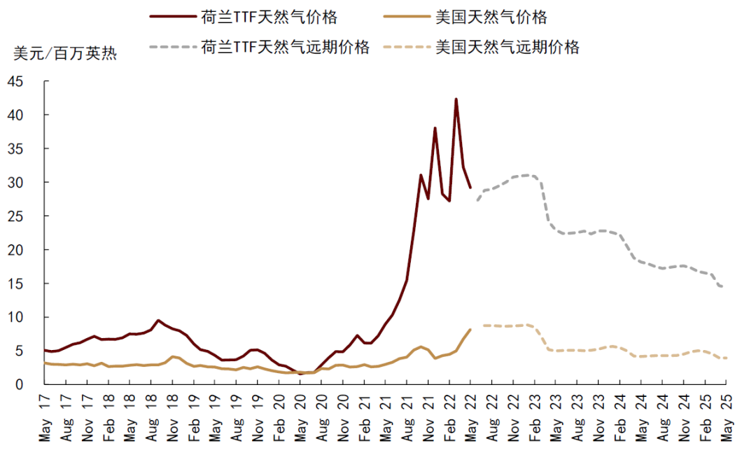 往前看,我们认为海外气价有望在淡季补库阶段趋稳,但由于俄气供应风险并未解除,欧洲库存修复仍存难度,欧洲气价中枢的支撑或将延续。而美国LNG的出口需求也将对其库存和基本面形成一定压力,且欧洲市场的供需紧张也仍有价格外溢风险。我们判断欧洲气价中枢或将在2H22处于20-30美元/百万英热之间,而美国气价则可能在6-8美元/百万英热区间波动。