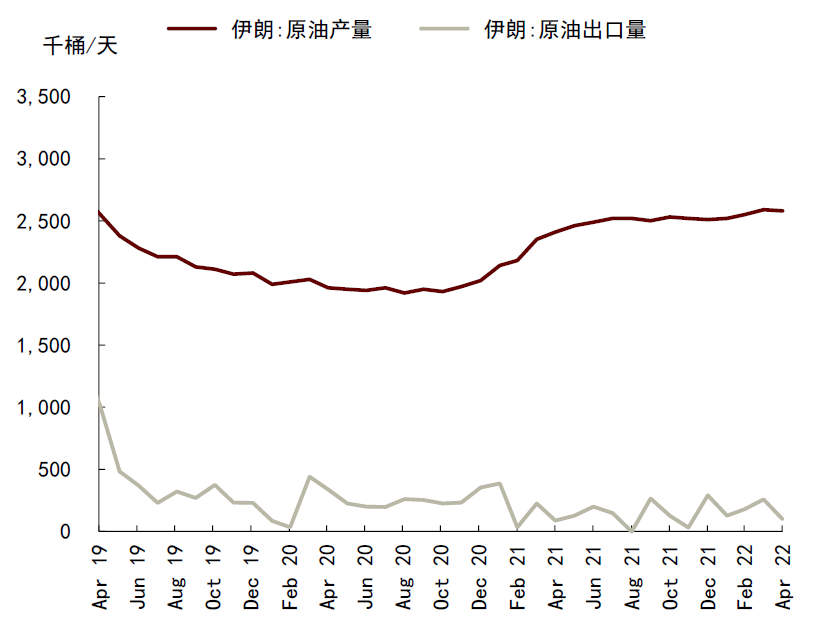 除了参与产量协议的OPEC 10国,2022年4月利比亚和伊朗的原油产出也有所下滑,拖累OPEC整体产出环比增量降至1万桶/天。其中,受国内政治局势和港口关闭的影响,3-4月利比亚原油产量累计减少22万桶/天,成为了OPEC整体产出修复的最主要拖累。此外,伊核谈判也尚未有定论,4月伊朗原油产量为258万桶/天,较制裁前水平约有150万桶/天的差距,而原油出口也仍未恢复。我们曾多次提示,伊朗原油为2022年油市供给侧的重要“X因素”,若能够重返市场将对俄罗斯原油供应受阻的负面影响形成较强缓冲。
