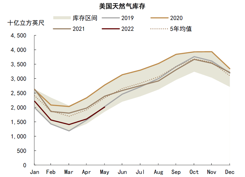 美国或将成为欧洲LNG的最主要来源,年贸易量或不仅限于约定的400亿立方米,出口需求也将对美国国内的天然气基本面形成一定压力。目前美国天然气库存位于历史相对低位,并将于6月正式进入夏季用气小高峰,从当前情况来看,我们判断产量或将维持线性增加,保持高位的LNG出口流量或将使库存于今夏持续处于低位。