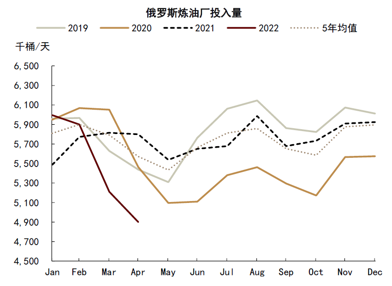俄罗斯成品油出口在3-4月已经发生了明显下滑。在美国、英国对俄油及成品油颁布进口禁令后,4月俄罗斯成品油出口量为261万桶/天,较2月减少近65万桶/天,其中去往美国和英国的成品油分别减少了50万桶和18万桶/天。我们也在前面提到,成品油出口需求下滑一定程度上解释了俄炼油厂投入和石油产出的明显减量。