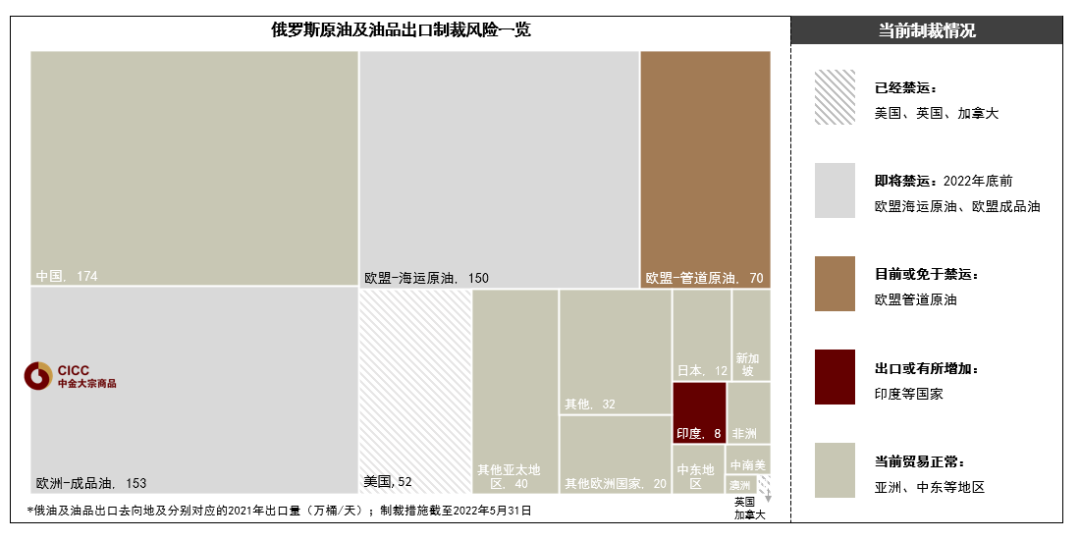 在美国、英国和加拿大决定禁止进口俄油及油品进口后,5月,欧盟也提出将加入俄油“有序减量”的制裁行列,对俄罗斯石油出口施加制裁[3],但由于高度依赖于俄罗斯原油、特别是Dzuzhba管道油的匈牙利、斯洛伐克和捷克等国提出反对俄油禁运,目前欧盟提出通过先禁运海运油的方式对俄进行制裁,而管道运输或得以避免禁运。2021年欧盟对俄罗斯原油和油品的总进口量约为370万桶/天,其中220万桶/天的进口原油中约有32%通过管道运输抵达,因而若欧盟海运油禁令落地,将对俄罗斯原油和油品出口造成约300万桶/天的损失,叠加之前美国、加拿大和英国已经采取的禁运措施,我们判断俄罗斯原油和油品出口预计将合计减少约350-360万桶/天。但就目前贸易情况来看,虽然极端的断供风险已过,俄罗斯原油实际出口的“有序减量”仍存较大不确定性,一方面欧盟的制裁执行情况仍有待观察,另一方面从欧美等国减少的进口需求可能会去往印度等地,全球来看,对俄罗斯原油及油品供应的“净损伤”或小于表观制裁数量。