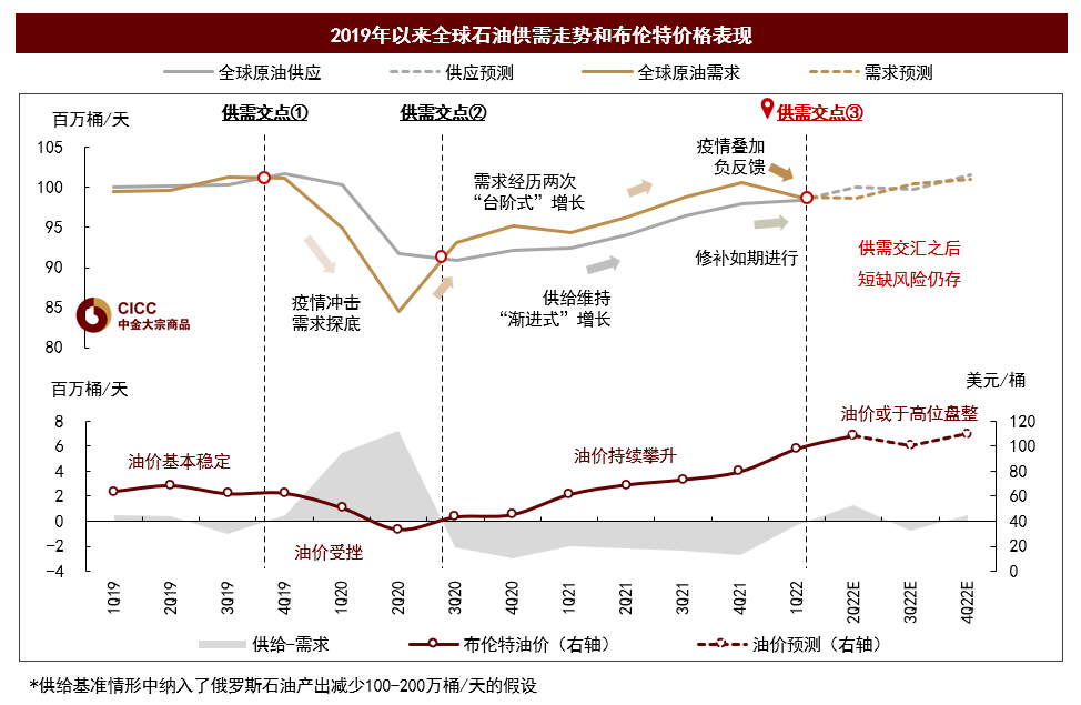 图表: 当前全球石油市场正处于2019年以来的第三次供需交点,然而油价或不会随缺口的收敛而快速回落