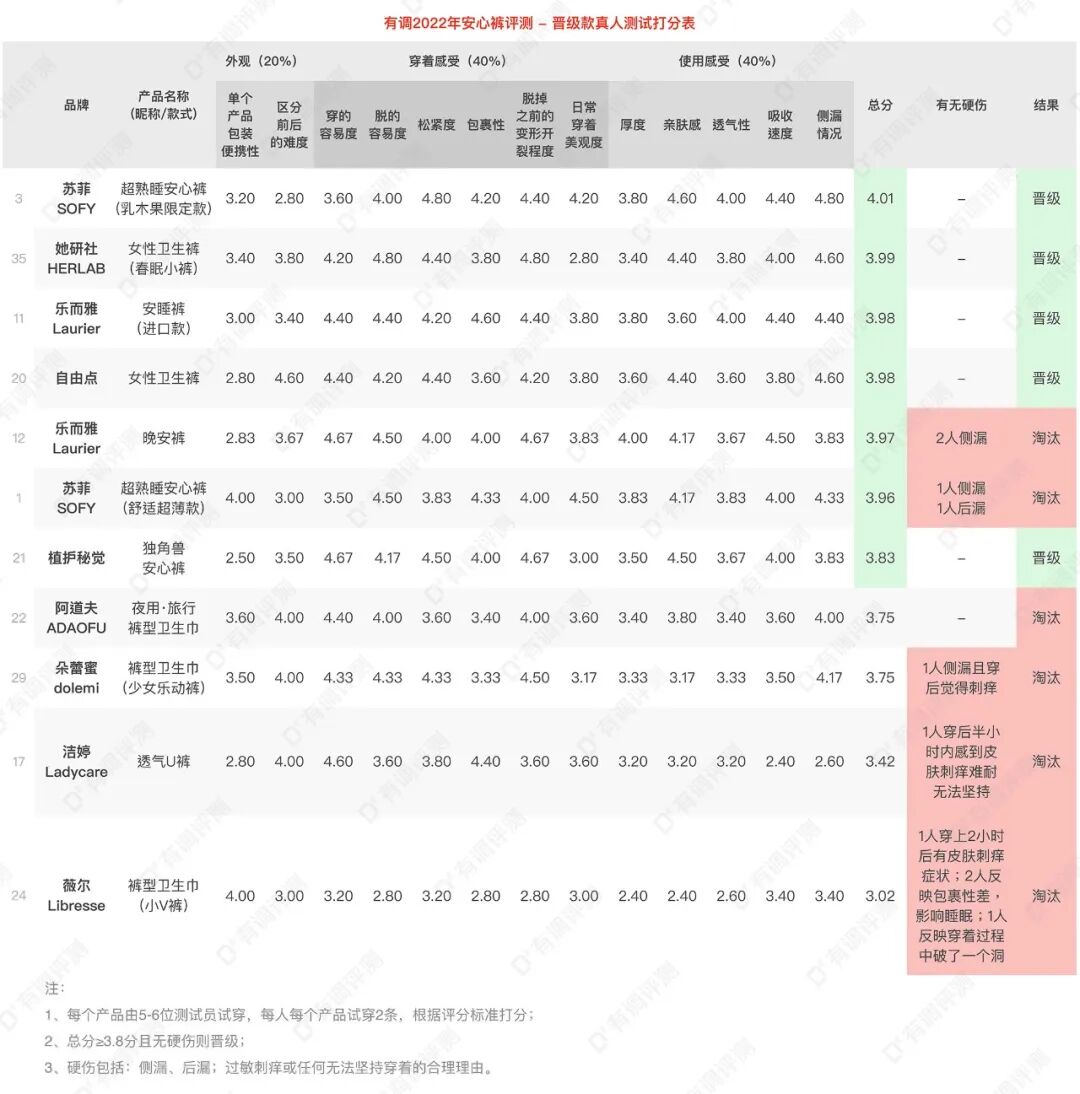 感谢调友“眼儿媚Zona”的提醒,由于我们工作失误,在安心裤评测报告晋级款真人测试打分表中,产品名称那列发生了错乱,在此向大家道歉,并将勘误后的表格放上。