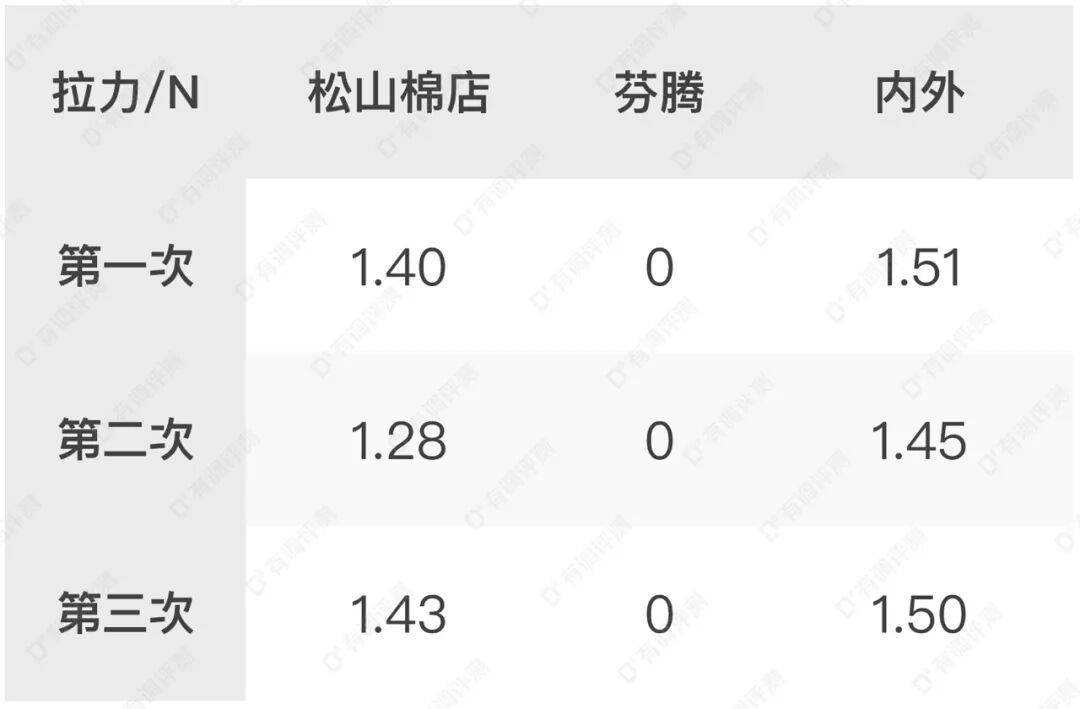 由以上结果可知,松山棉店、内外在拉力测试中表现较好,只有芬腾由于拉力过小,示数为“0”;但在实际真人测试中,三款经期内裤配合不同品牌和长度卫生巾使用时均未发现滑动移位现象。