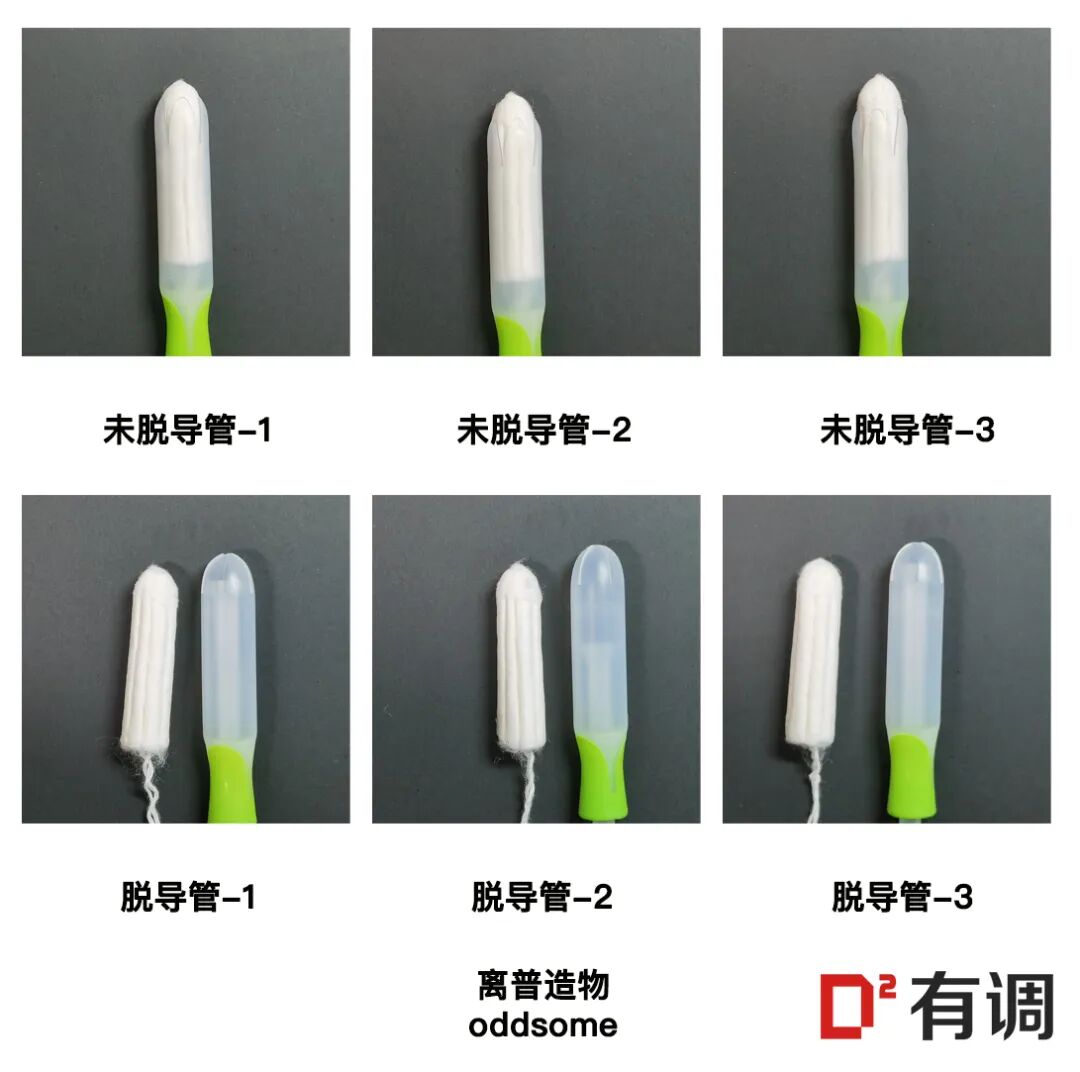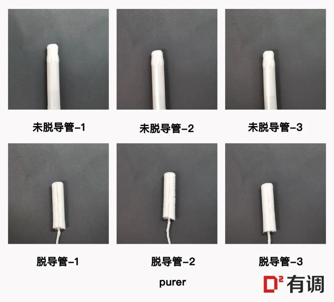 首先,取同品牌、同规格的三根棉条,开封后将它们微微推出导管,观察顶端棉絮情况并拍照记录;再另取3根将棉条整根推出,观察整根棉条的棉絮情况并拍照记录。