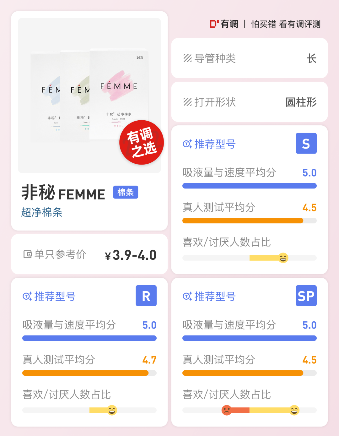 真是冤枉呀,我们没拿品牌方一分钱,前前后后花了大几千,吭哧吭哧做了大半个月淘汰性实验,然后由于有调内部有棉条使用经验的小姐姐数量不够,不足以支撑真人体验环节,还花了近2个月时间招募了15位有资深棉条使用经验的调友来帮大家测试这些棉条体感如何,最后综合测试数据和调友们的打分及文字反馈,才选出了这些推荐款。